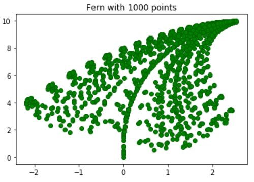 ○バーンスレイのシダ 4種類の変換をそれぞれ、85%、7%、7%、1%の確率で選んでいきます。 # -*- coding: utf-8 -*- import numpy as np import matplotlib.pyplot as plt def transform1(p): x, y = p[0], p[1] x1 = 0.85*x + 0.04*y y1 = -0.04*x + 0.85…